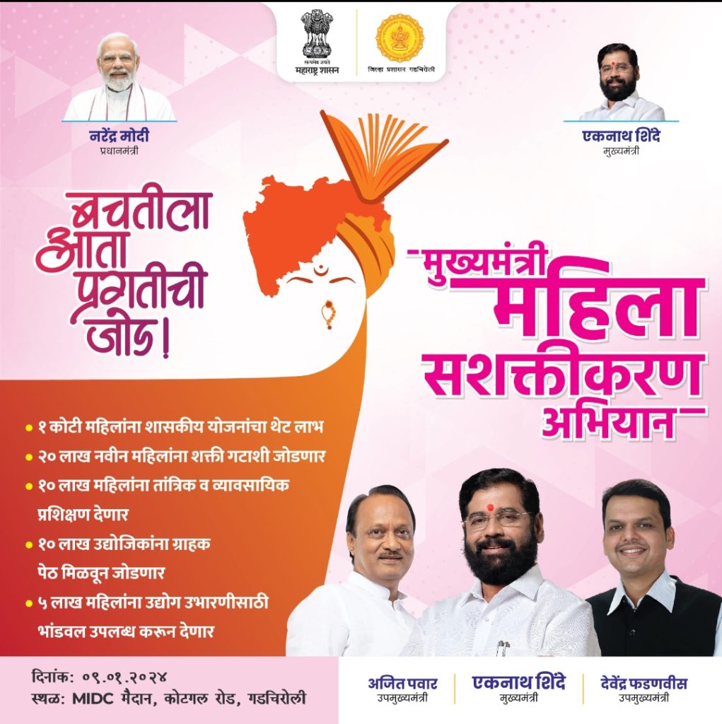 गडचिरोली 8 जानेवारी:- राज्यामध्ये महिलांच्या संदर्भात असणाऱ्या शासकिय योजना लोकाभिमुख करुन त्यांची अंमलबजावणी गतीमान करण्यासाठी दिनांक 09 जानेवारी, 2024 रोजी “मुख्यमंत्री महिला सशक्तीकरण अभियान” अंतर्गत विविध योजनांच्या लाभार्थ्यांना थेट लाभ तसेच विविध शासकीय योजनांच्या माहितीचा विस्तृत प्रमाणावर प्रसार करण्यासाठी शासनाच्या धोरणानुसार या विशेष कार्यक्रमाचे आयोजन करण्यात आले आहे.
