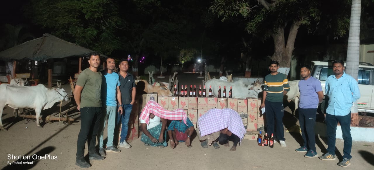 या माहितीच्या आधारावर स्थानिक गुन्हे शाखेच्या पथकाने मौजा टेकडा गावालगत असणाया नदी परीसरात सापळा रचुन त्याच्या दिशेने येणाया तीन बैलगाड्या व पोलीसांचा कानोसा घेण्याकरीता वापरण्यात आलेल्या दुचाकीस ताब्यात घेऊन पाहणी केली असता, सदर तीन्ही बैलगाड्यामध्ये मोठ्या प्रमाणात बिअर व व्हिस्की असा विदेशी दारुचा मोठा साठा दिसुन आल्याने सर्व मुद्देमाल जप्त केला. सदर कारवाईदरम्यान पोलीस पथकाने 50 बॉक्समधील 2,52,000/- रुपये किमतीचा विदेशी दारु साठा जप्त केला तसेच दारु तस्करीकरीता वापरण्यात आलेल्या 3 बैलगाड्या व ईतर 1,70,000/- रुपये किंमतीचा असा एकुण 4,22,000/- रुपये किंमतीचा मुद्देमाल मोक्यावर जप्त करुन उप पोलीस स्टेशन बामणी येथे आरोपी संदिप देवाजी दुर्गम, व्यंकटी बकय्या कोटम, बापु मलय्या दुर्गम, श्रीनिवास ईरय्या दुर्गम सर्व रा. टेकडा (ताला) या चार आरोपीतांना जेरबंद करुन गुन्हा नोंद करण्यात आला.