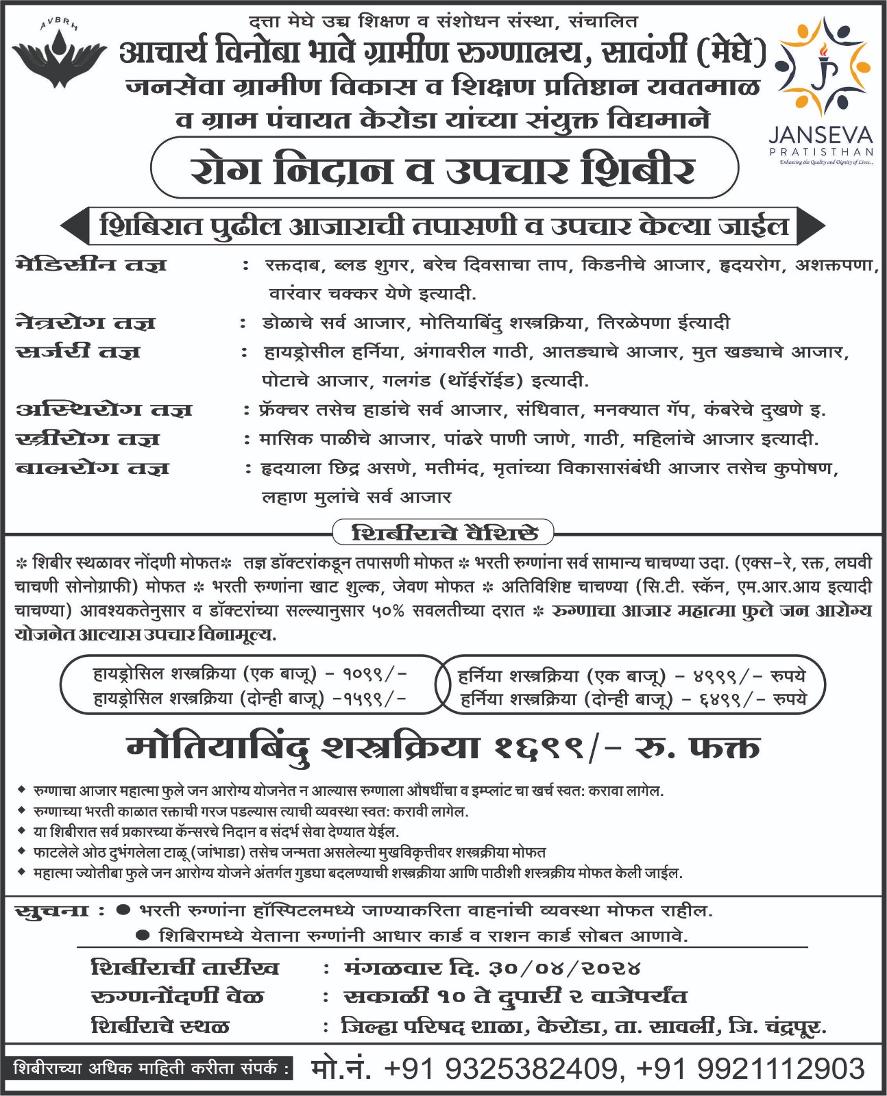 सावली २९ एप्रिल : आचार्य विनोबा भावे ग्रामीण रुग्णालय, सावंगी मेघे, जनसेवा ग्रामीण विकास व शिक्षण प्रतिष्ठान यवतमाळ व ग्रा. पं.केरोडा यांच्या संयुक्त विद्यमाने उद्या ३० एप्रिल रोजी सकाळी १० ते दुपारी २ वाजतापर्यंत जिल्हा परिषद शाळा केरोडा येथे रोग निदान व उपचार शिबिराचे आयोजन करण्यात आले आहे.