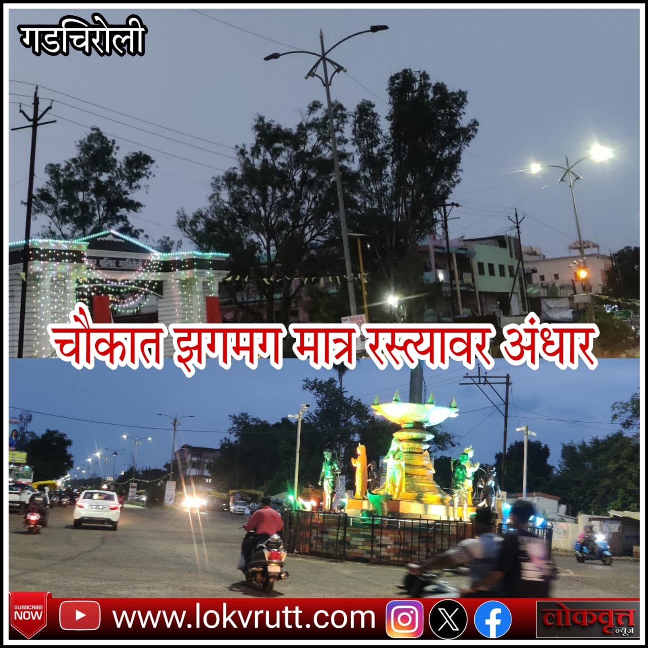 गडचिरोली शहरातील मुख्य चौकात तसेच मुख्य मार्गावर नेहमीच वर्दळ असते. नगर परिषदेमार्फत नव्याने पथदिवे लावण्यात आले आहे. तर स्वातंत्र्य दिनानिमित्त मुख्य चौकात झगमग करण्यात आली आहे याबाबत नागरिकांनी आनंद व्यक्त केला असला तरी मुख्य मार्गावरील पथदिवे मात्र बंद स्थितीत असल्याने अंधार पसरला आहे. अनेक ठिकाणचे पथदिवे बंद स्थितीत पहावयास मिळत आहे. नागरिक रात्रीच्या सुमारास फिरावयास निघतात, अश्याच या मार्गावर वाहनांची वर्दळ नेहमीच असते. नगर परिषदेमार्फत लावण्यात आलेल्या पथदिवे बंद असल्याने मात्र रस्त्यावर अंधार पसरलेला आहे. त्यामुळे चौकात जरी झगमग केली असली तरी मार्गावर अंधार पसरला असल्याने त्याकडे नगर परिषदेचे दुर्लक्ष असल्याचे दिसून येते आहे. पुन्हा एकदा नगर परिषदेचा हा प्रताप शहरात चर्चेचा विषय ठरला आहे.