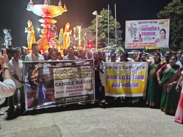 कोलकाता येथील के आर जी कर वैद्यकीय महाविद्यालय तथा रुग्णालयातील बलात्कार पीडित महिला डॉक्टर सुवर्मा गोस्वामी यांच्या अत्याचाराच्या विरोधात जाहीर निषेध करण्यासाठी सामाजिक कार्यकर्त्या डॉ.सोनल कोवे यांच्या नेतृत्वाखाली गडचिरोली येथील शासकीय विश्रामगृहात शुक्रवार १६ ऑगस्ट २०२४ रोजी सायंकाळी ६ वाजता कॅंडल मोर्चा काढण्यात आला.