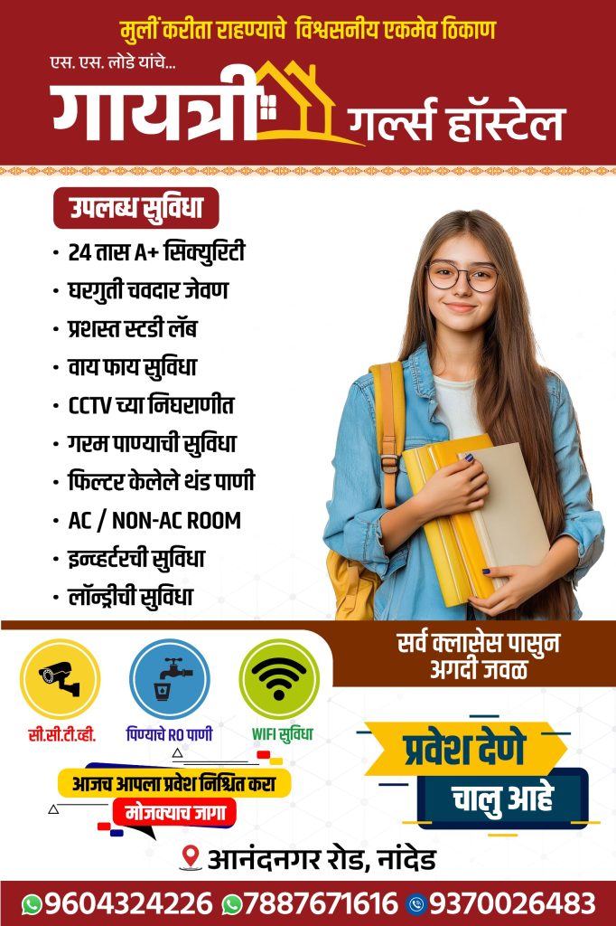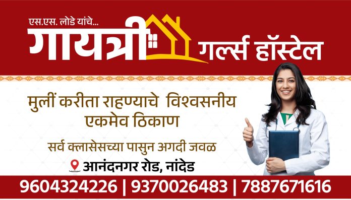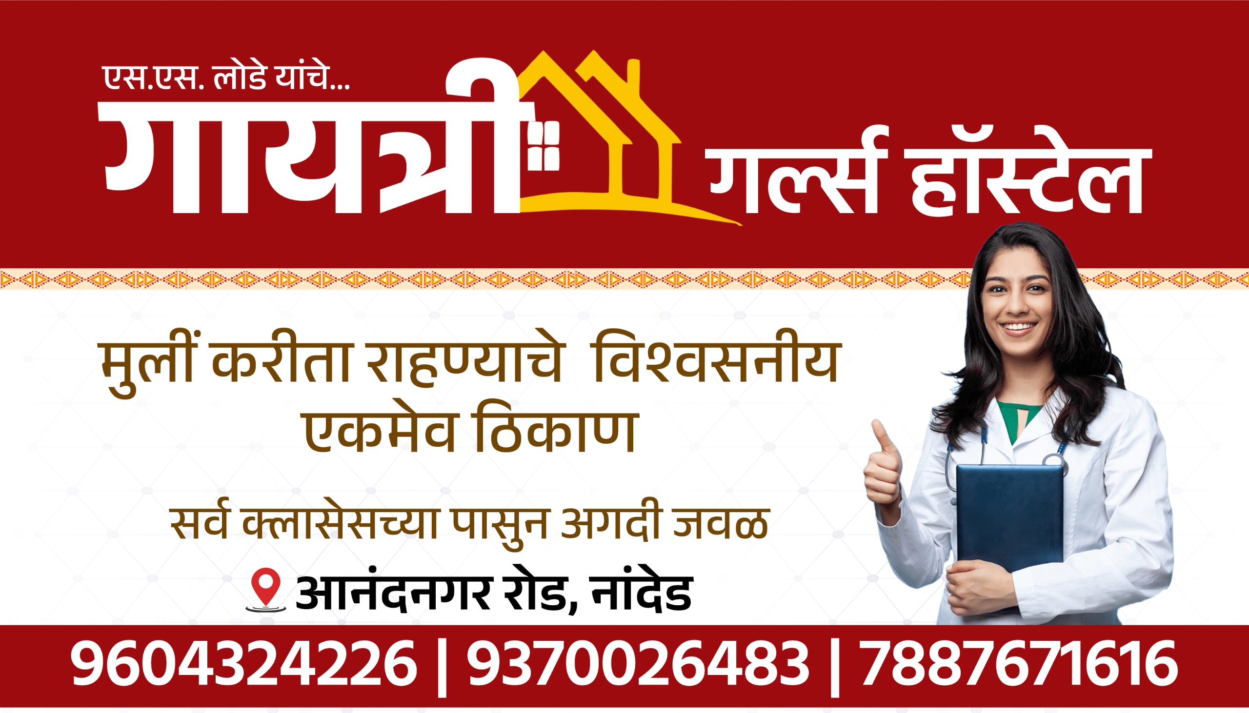 गायत्री गर्ल्स हॉस्टेल – मुलींसाठी निवासाचे विश्वासार्ह एकमेव ठिकाण. पत्ता : आनंदनगर रोड, नांदेड