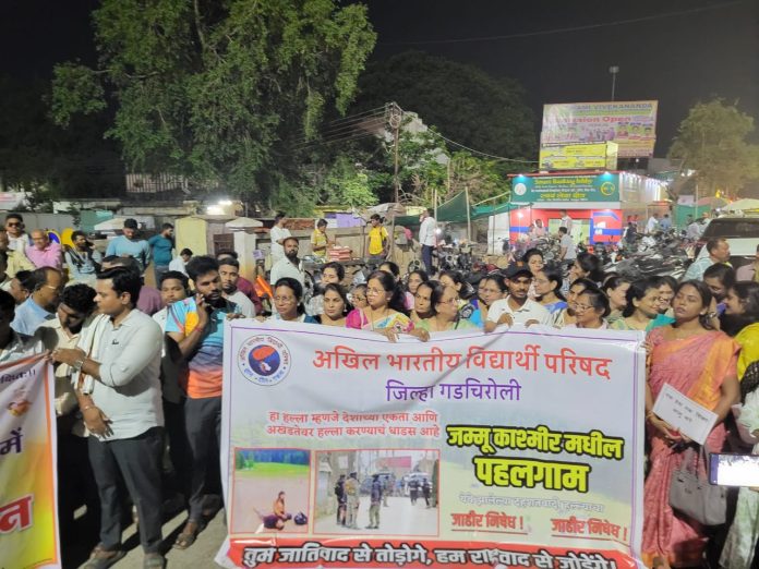 गडचिरोली : जम्मू-काश्मीरमधील पहलगाम येथे झालेल्या भ्याड दहशतवादी हल्ल्याचा अखिल भारतीय विद्यार्थी परिषद (अ.भा.वि.प.) गडचिरोली जिल्हा वतीने तीव्र निषेध करण्यात आला. या घटनेत मृत्युमुखी पडलेल्या निरपराध नागरिकांच्या कुटुंबीयांच्या आक्रोशाने संपूर्ण देश हादरला आहे.