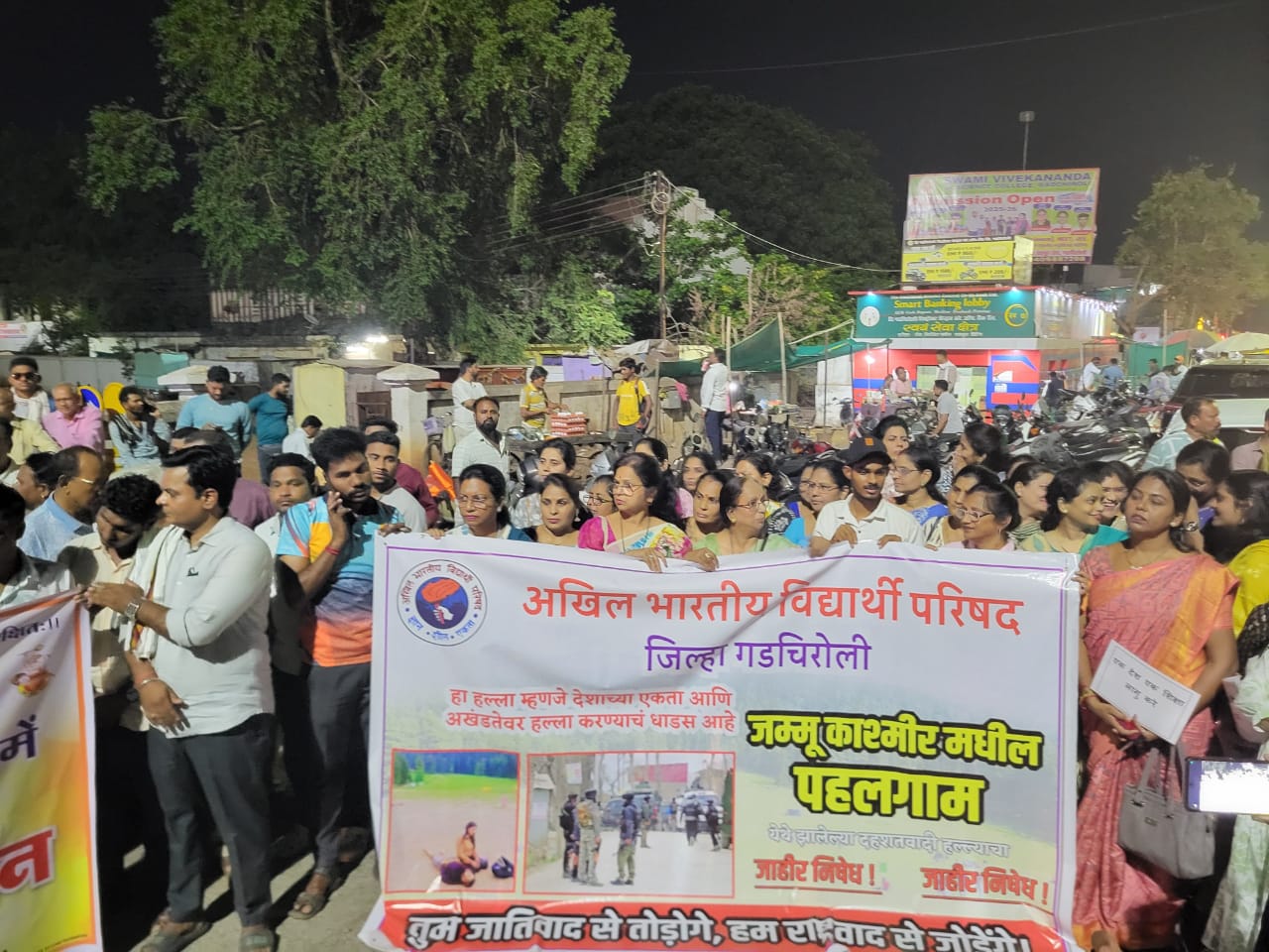 इंदिरा गांधी चौक, गडचिरोली येथे आयोजित शोकसभेत हल्ल्यातील पीडितांना श्रद्धांजली अर्पण करण्यात आली. त्यानंतर पाकिस्तानचा जाहीर निषेध करण्यात आला. या प्रसंगी अभाविप विभाग प्रमुख प्रा. धर्मेंद्र मुनघाटे, विदर्भ प्रांत सहमंत्री अभिलाष कुनघाडकर, नगराध्यक्ष प्रा. सुनीता साळवे, प्रांत कार्यकारिणी सदस्य प्रणय मस्के, नगरमंत्री विकास बोदलकर, धानोरा नगरमंत्री संकेत मस्के, जिल्हा मिडिया प्रमुख करण चौधरी, शुभम कुनघाडकर, जिल्हा संघ चालक घुसुलालजी काबरा, तसेच प्रशांत भ्रृगवार, अनिल पोहनकर, स्वरूप तारगे, दीपक बोटरे, हर्षल गेडाम यांच्यासह अनेक कार्यकर्ते उपस्थित होते.