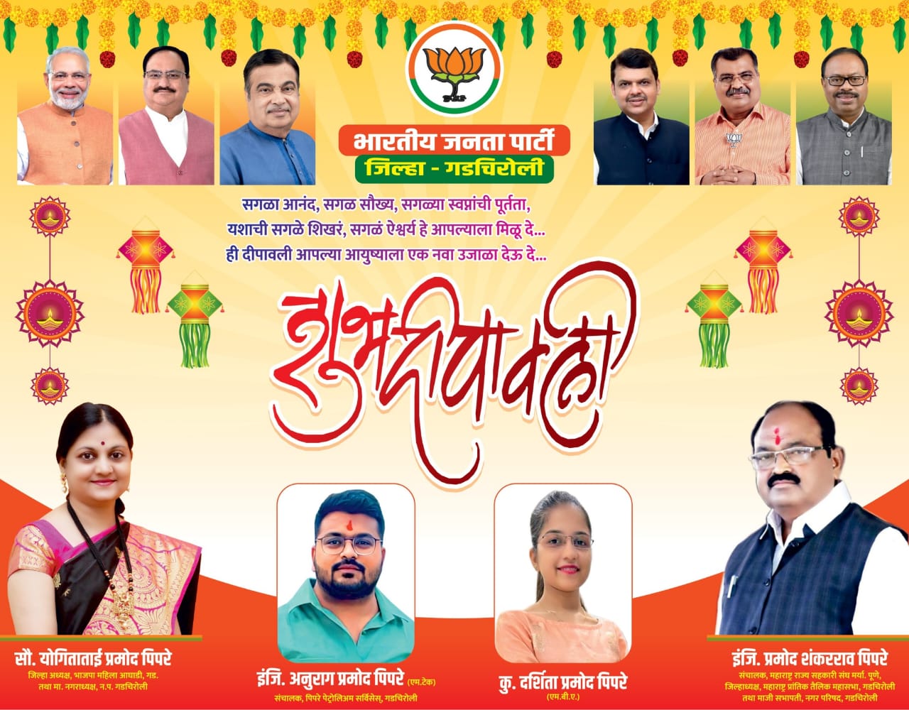 गडचिरोली पिपरे परिवार तर्फे समस्त जनतेला दीपावलीच्या हार्दिक शुभेच्छा! By Lok वृत्त - October 21, 2025 79 Share WhatsAppFacebookTelegramTwitter सगळा आनंद, सगळ सौख्य, सगळ्या स्वप्नांची पूर्तता, यशाची सगळे शिखरं, सगळं ऐश्वर्य हे आपल्याला मिळू दे… ही दीपावली आपल्या आयुष्याला एक नवा उजाळा देऊ दे… शुभेच्छुक :- पिपरे परिवार तर्फे समस्त जनतेला दीपावलीच्या हार्दिक शुभेच्छा!