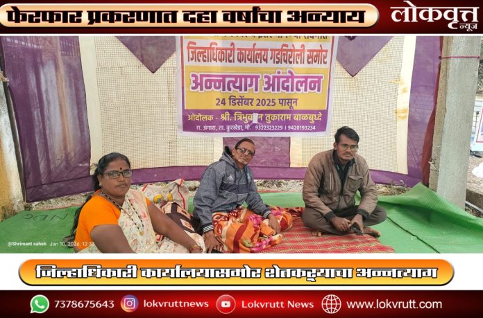 गडचिरोली, दि. ११ : कुरखेडा तालुक्यातील अंगारा येथील शेती शेती फेरफार प्रकरणात गेल्या दहा वर्षांपासून न्याय न मिळाल्याने त्रिभुवन तुकाराम बाळबुद्धे (रा. अंगारा) यांनी जिल्हाधिकारी कार्यालय, गडचिरोली समोर अन्नत्याग आंदोलन सुरू केले आहे. महसूल प्रशासनाच्या दिरंगाई व उदासीनतेमुळे आपल्यावर अन्याय होत असल्याचा आरोप आंदोलनकर्त्यांनी केला आहे.