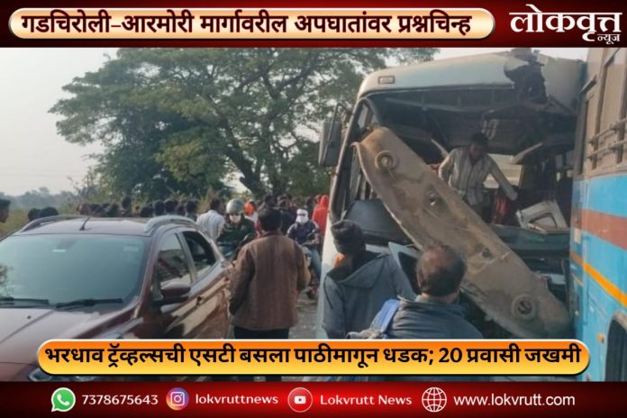 आरमोरी दि.१९ :- गडचिरोली–आरमोरी मार्गावर चुरमुरा गावानंतरच्या वळणाजवळ सोमवारी (दि. 19) सकाळी घडलेल्या भीषण अपघातात भरधाव ट्रॅव्हल्सने एसटी बसला पाठीमागून धडक दिली. या अपघातात ट्रॅव्हल्समधील तब्बल 20 प्रवासी जखमी झाले असून एसटी बसचे सुमारे 50 हजार रुपयांचे नुकसान झाले आहे. सुदैवाने या घटनेत कोणतीही जीवितहानी झाली नाही. या प्रकरणी आरमोरी पोलीस ठाण्यात गुन्हा दाखल करण्यात आला आहे.