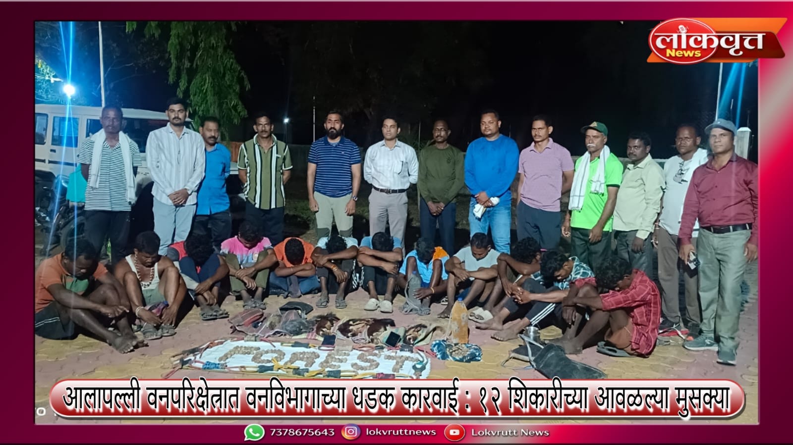 आलापल्ली : आलापल्ली वनपरिक्षेत्रात सामूहिक जंगल गस्ती दरम्यान वनविभागाने मोठी कारवाई करत १२ शिकाऱ्यांच्या मुसक्या आवळल्या असून त्यांच्या ताब्यातून वन्यजीवांचे अवयव व शिकारीसाठी वापरण्यात येणारे साहित्य जप्त करण्यात आले आहे. या प्रकरणी भारतीय वन अधिनियम, 1927 तसेच वन्यजीव संरक्षण अधिनियम, 1972 अंतर्गत गुन्हे नोंदविण्याची प्रक्रिया सुरू करण्यात आली आहे.
